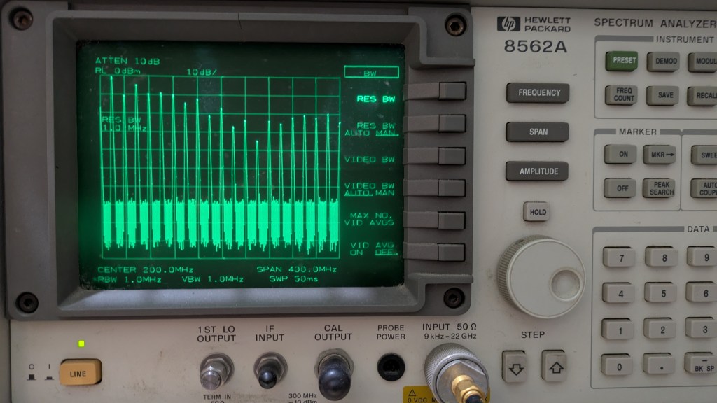 Refer to the photos below. Note that the actual output is 10dB higher because a 10dB attenuator is inserted (see above photo). The power at 200MHz which is the 10th harmonics is -10.3dBm which is a highly useful level. The power of the 20th harmonics (400 MHz) is -14.8dBm, which is still a useful level.