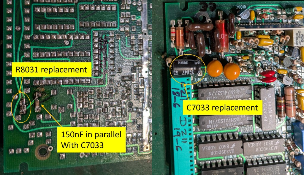 I remove the instrument cover to do visual check (fig.1). I power it on again. Naturally the first step is to check the various DC supply voltages to confirm if they are within spec. Interestingly when I am probing the test points one by one, I smell something strange. I turn off the equipment immediately and search for the source of unpleasant smell. The log & Video Amplifier module (A62) seems to be the culprit. Further disassembly work confirms this assumption. Refer to the fig. 2, the problem is a shorted tantalum capacitor. A resistor is also burned. Consulting the service manual, I find that the capacitor in question is C7033 which is the +15V supply decoupling capacitor. It is evident that this capacitor somehow becomes a short circuit so that R8031 (4.7ohm) drops most of the supply voltage. As a result the associated circuits do not receive 15V supply and thus malfunction.