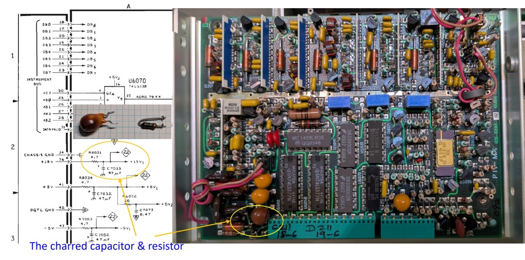 Several months ago I fixed the video offset problem of my HP8562A. (See the post: HP8562A Spectrum Analyzer Repair: Fixing Video Offset / Display Issues. ) Last week my Tek 494P refused to work – the display was blank after power on. A quick diagnosis revealed the following: