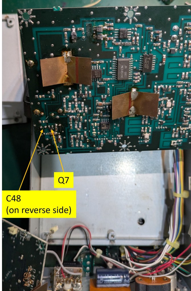 - Replace Q7 and C48. Turn on the set and check the voltages at points A, B, C again. The values should be then back to normal.