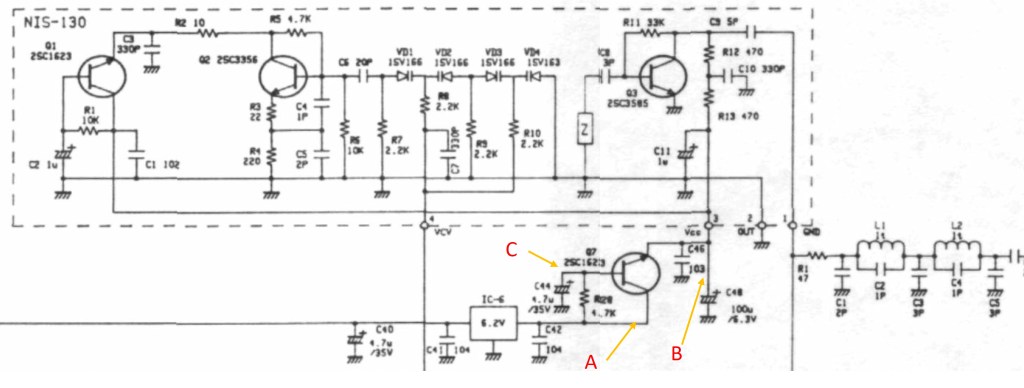- Now the various test points on the PLL board are accessible. Turn the set on. With a DVM, check the supply to the VCO. Refer to the partial schematic (fig.4), DC voltage at point A should be 6.2V +/-0.1V, point B should be 5.2V +/-0.1V. In my case, point A is 6.15V but point B is at zero volt (0V).